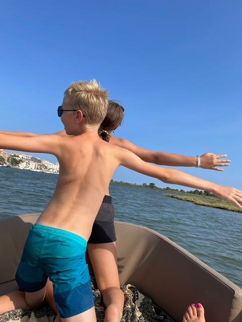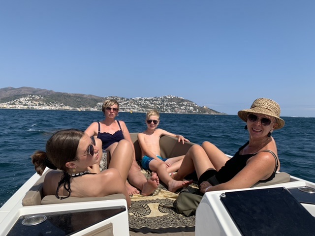 Namiddag gingen we even afkoelen in het zwembad en wandelden toen naar de bootverhuur. We huurden een bootje voor 6 personen gedurende 2 uren. Jo nam het stuur en we vaarden door de baai van Rosas, soms door rustig water, soms door wild water.
