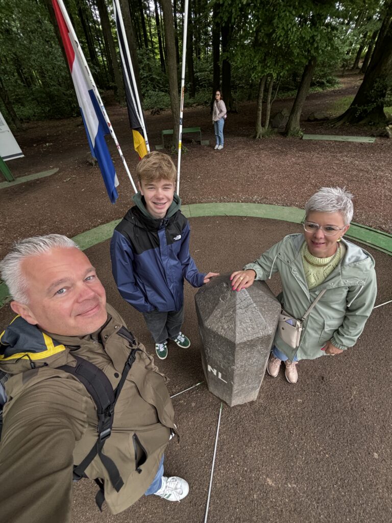 We parkeerden de Jimny op een dichtbijgelegen parking en wandelden over een bospad naar het drielandenpunt. Bij de grenspaal maakten we daar samen een foto die door iedereen gemaakt werk: alledrie in een ander land! Maar eerst even wachten tot de Japanners klaar waren…