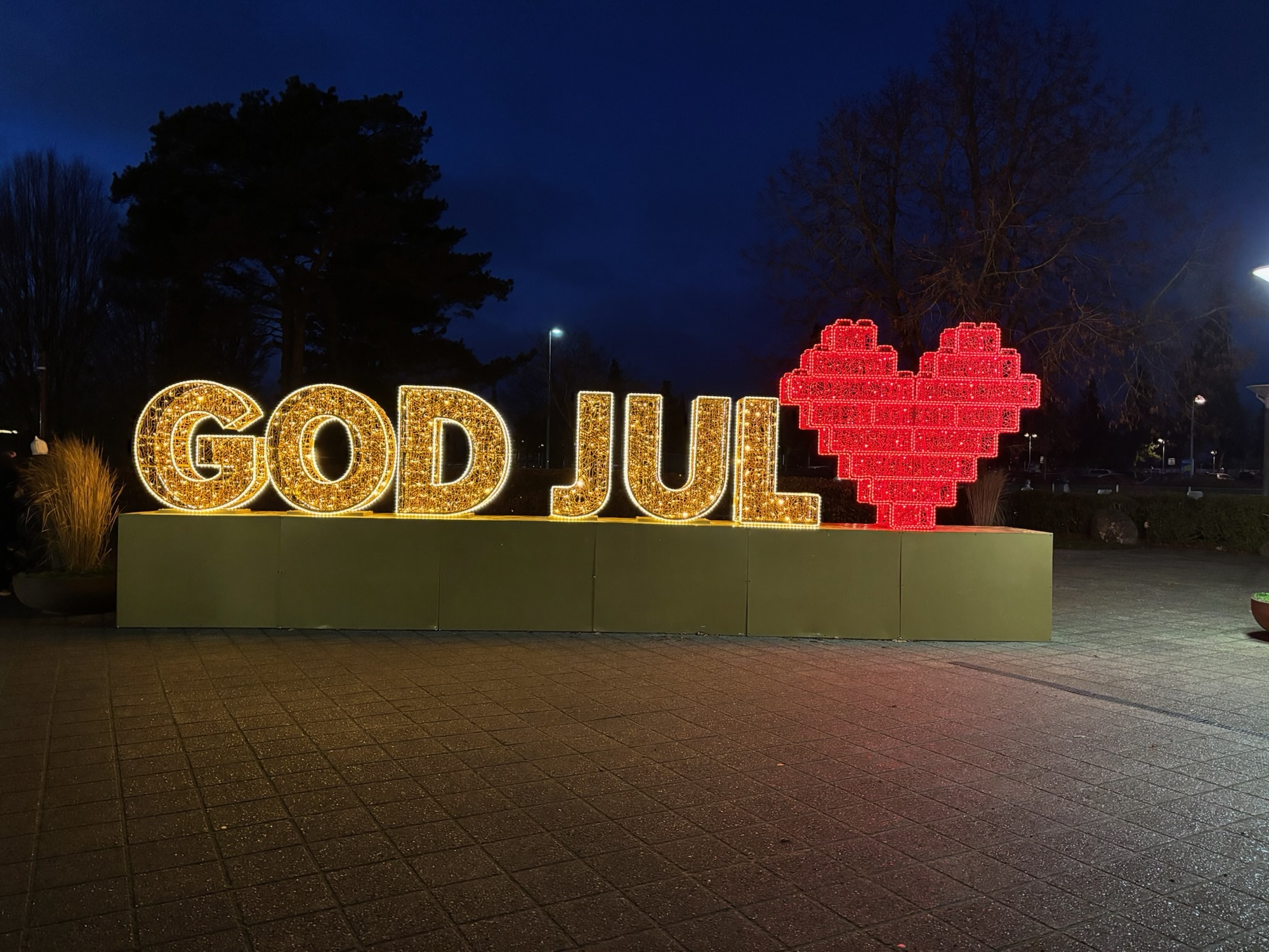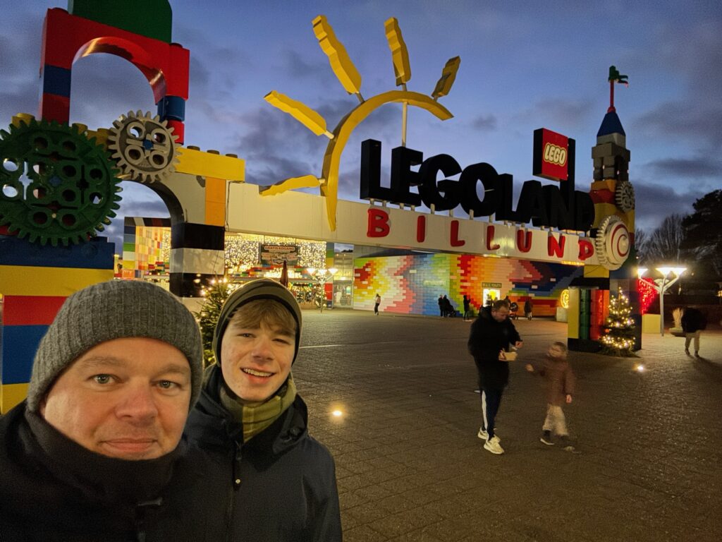 Mama maakte balletjes in tomatensaus met rijst en na de lunch fietsten we naar het centrum van Billund. We dronken alvast een koffie/choco in Legohouse, bezochten de Legowinkel aldaar (helaas geen vleugelpiano, Fabienne) en reden toen nog even door het donker naar Legoland. Onderweg passeerden we de kantoren van de LEGO hoofdzetel (heeeeeeel chique) en maakten nog even een foto aan de ingang van het park.