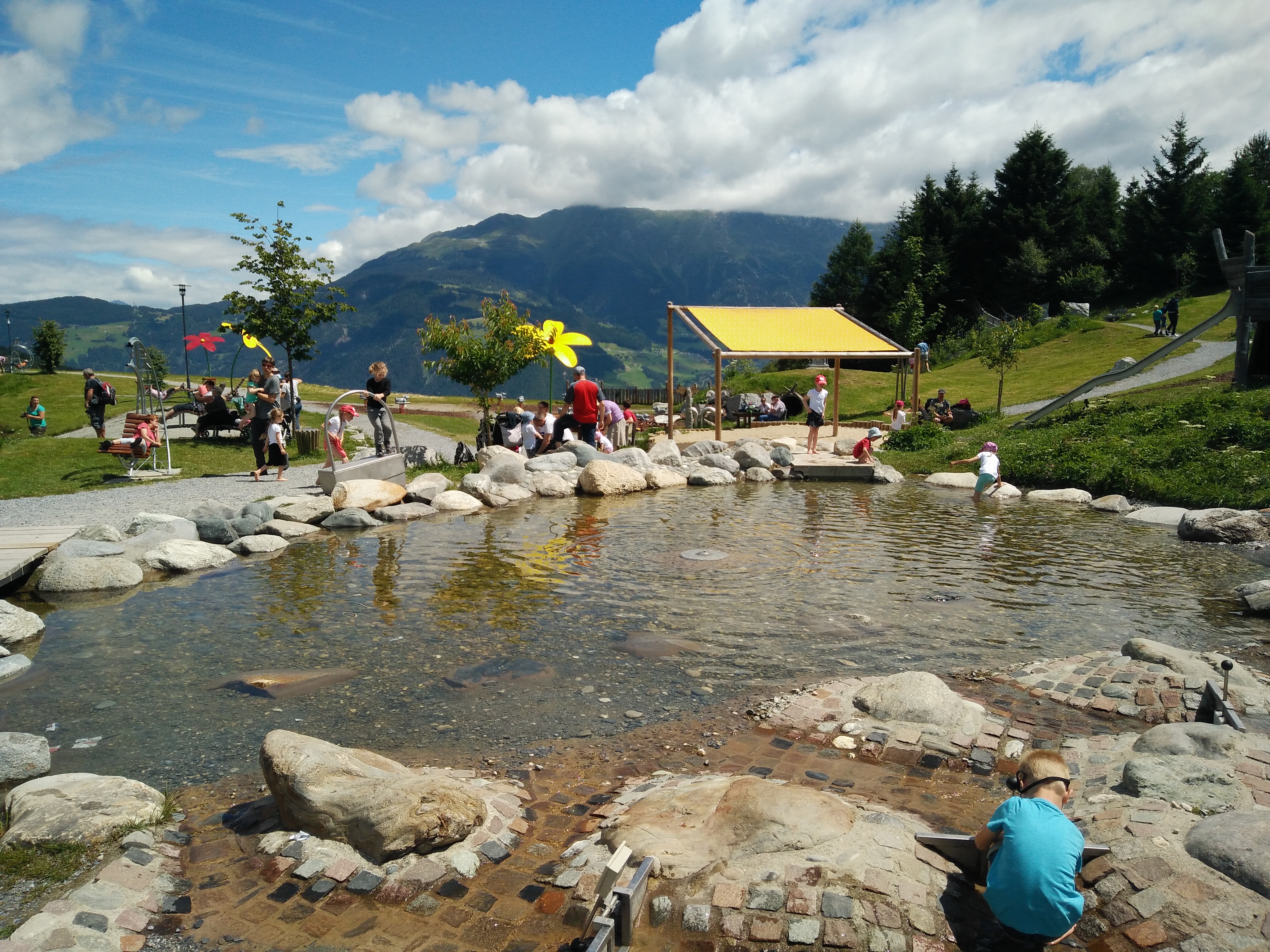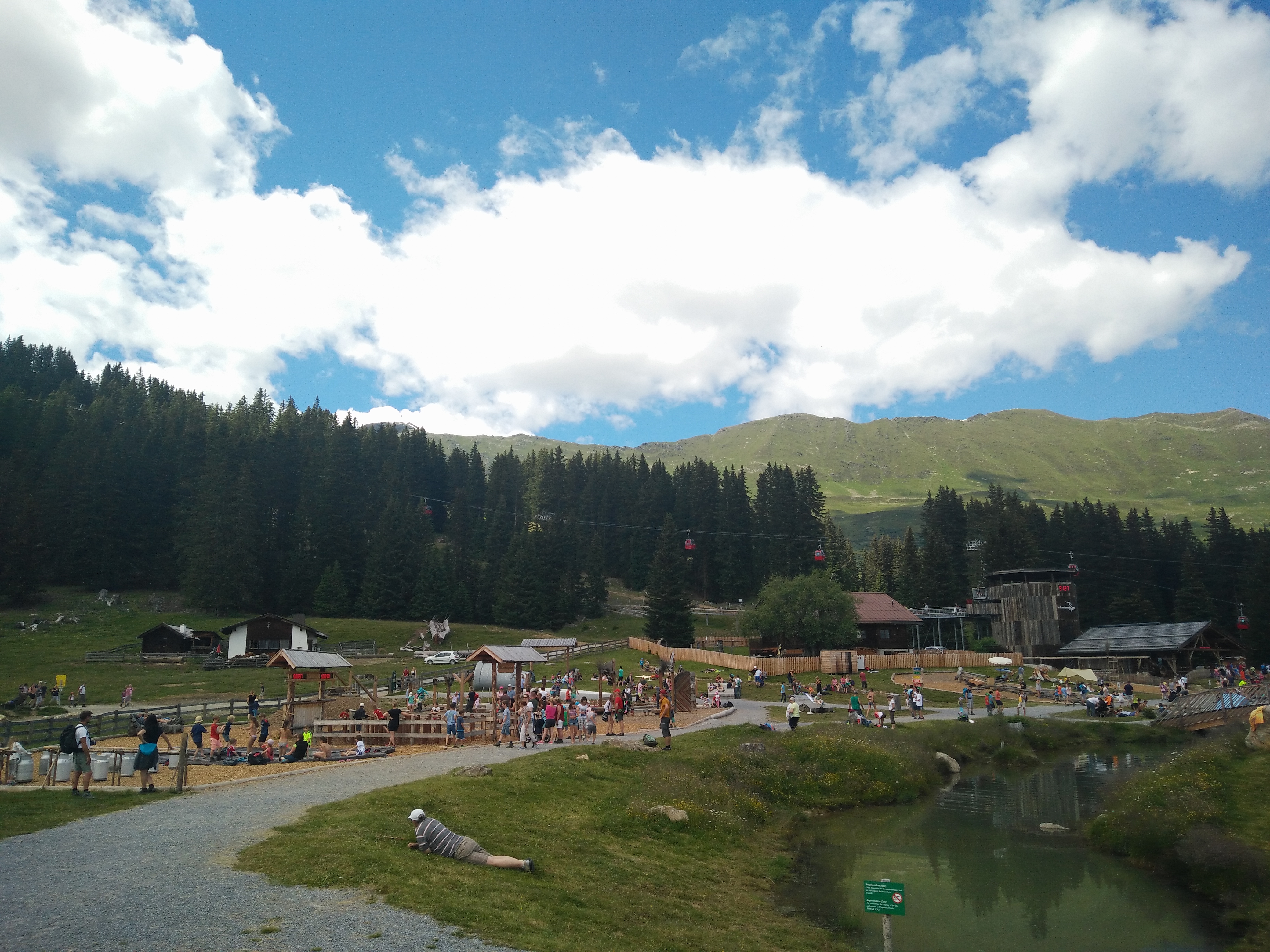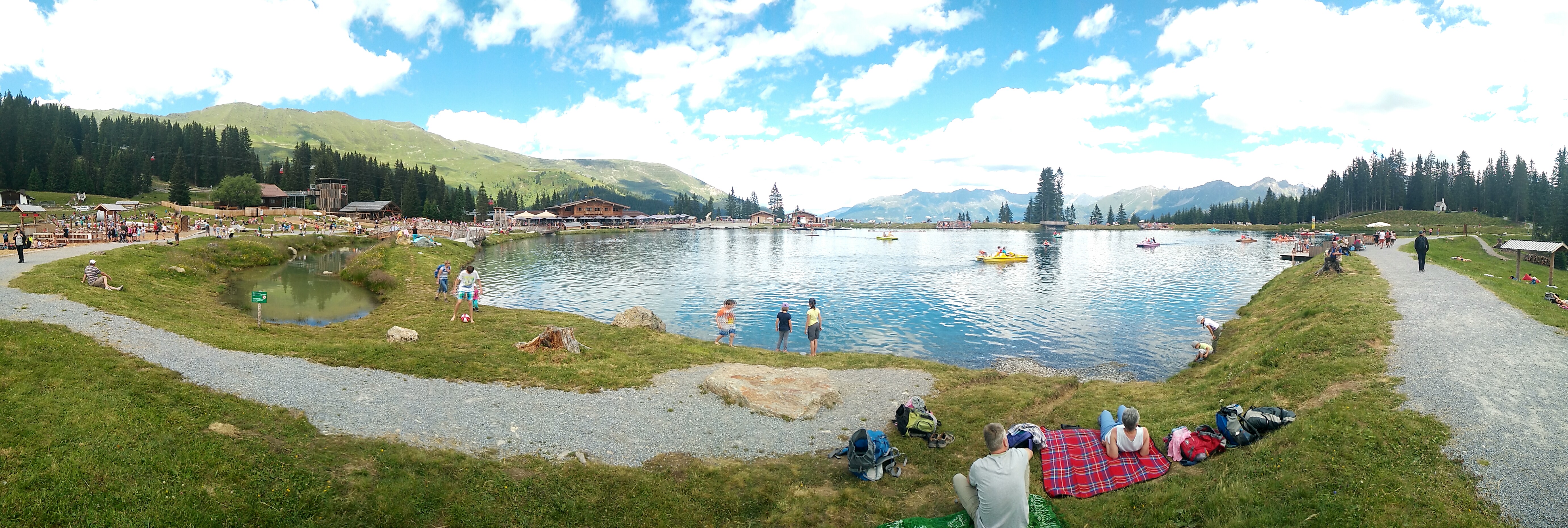 Gisteren begonnen we met een wandeling langs de Wolfsee en het indianendorp in Ladis. Aan de Wolfsee was het een drukte van jewelste. Het stralende weer zal er wel voor iets tussen gezeten hebben, en het feit dat het zondag was (veel lokale families met kinderen).