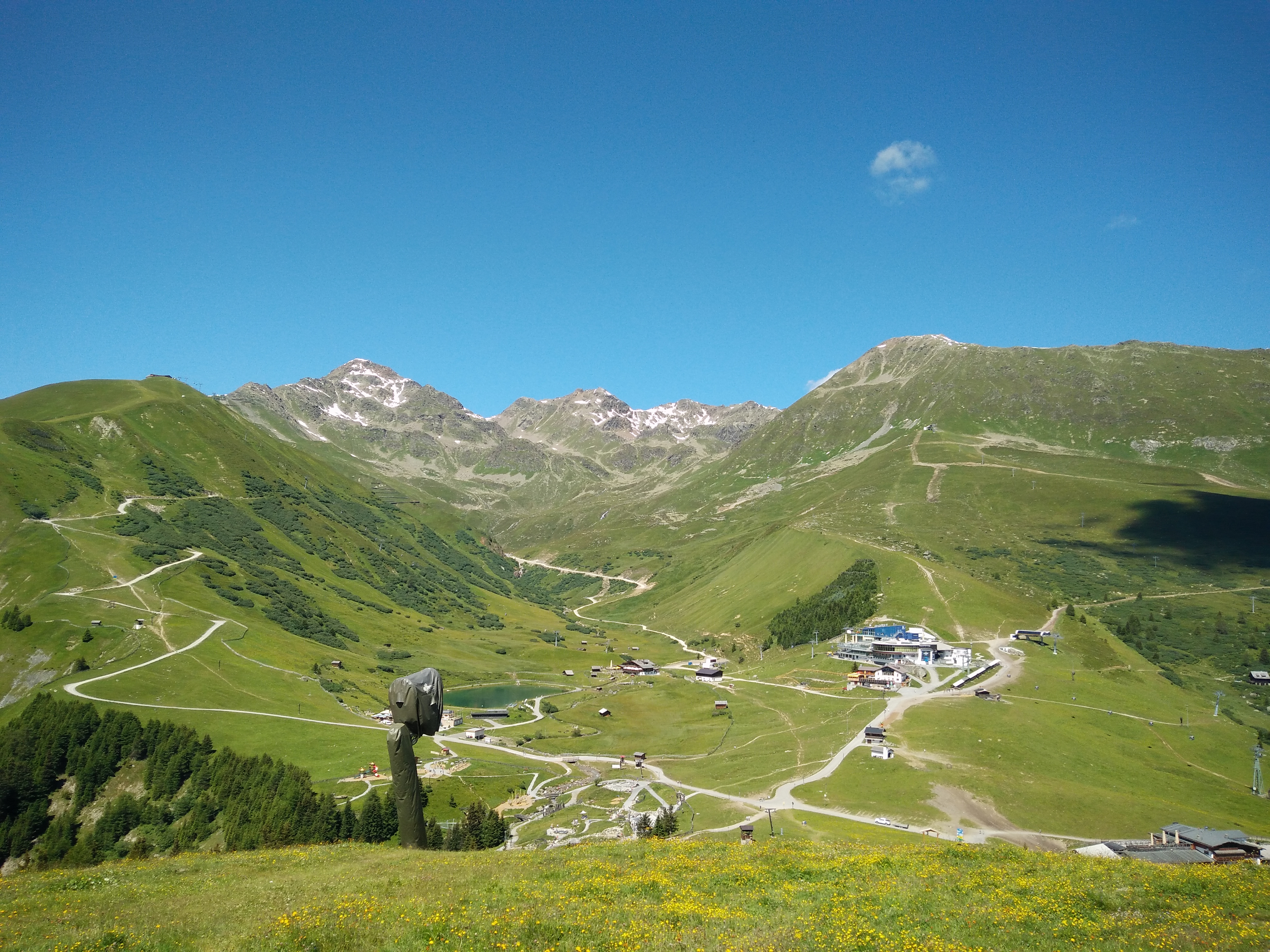 In Ladis aangekomen namen we opnieuw de bergbahnen tot helemaal boven in Fiss. Volgens mij heet het de Schönjoch, maar heel zeker ben ik niet. We zaten er op het dak van de wereld (of zo leek het toch) op een roterend bankje.