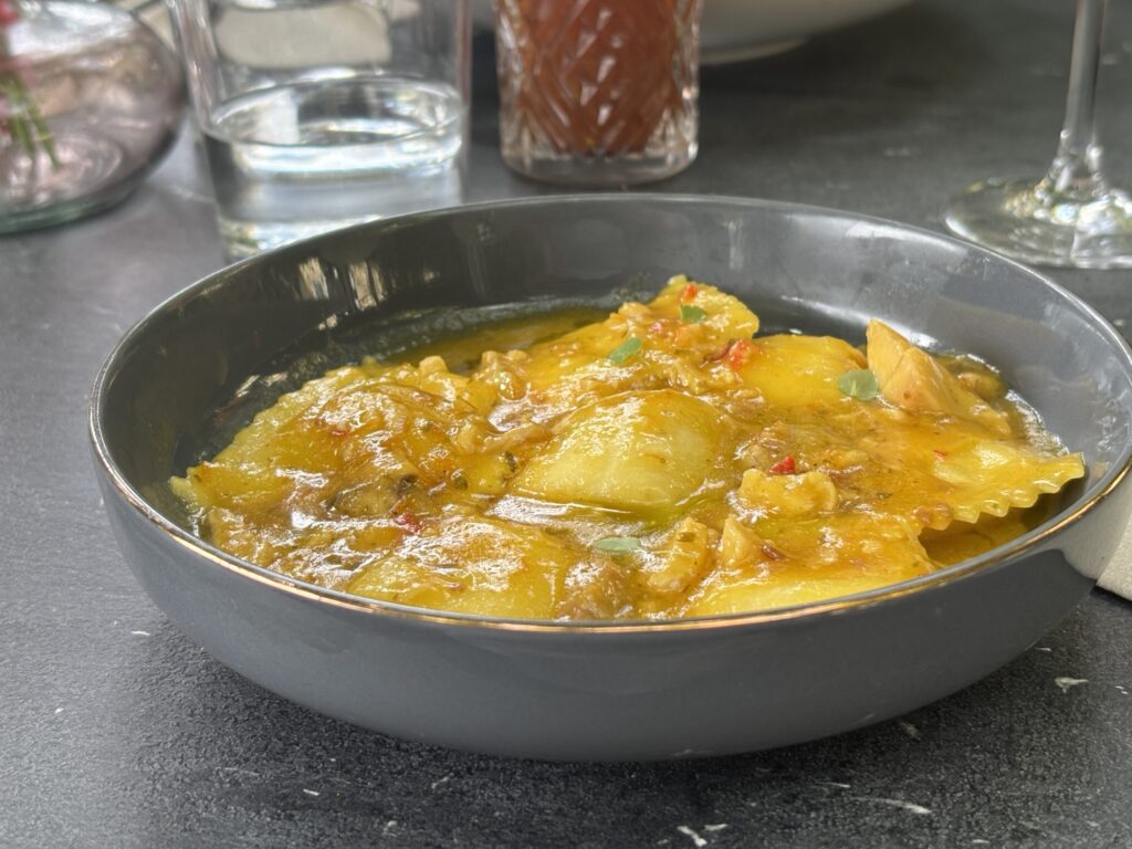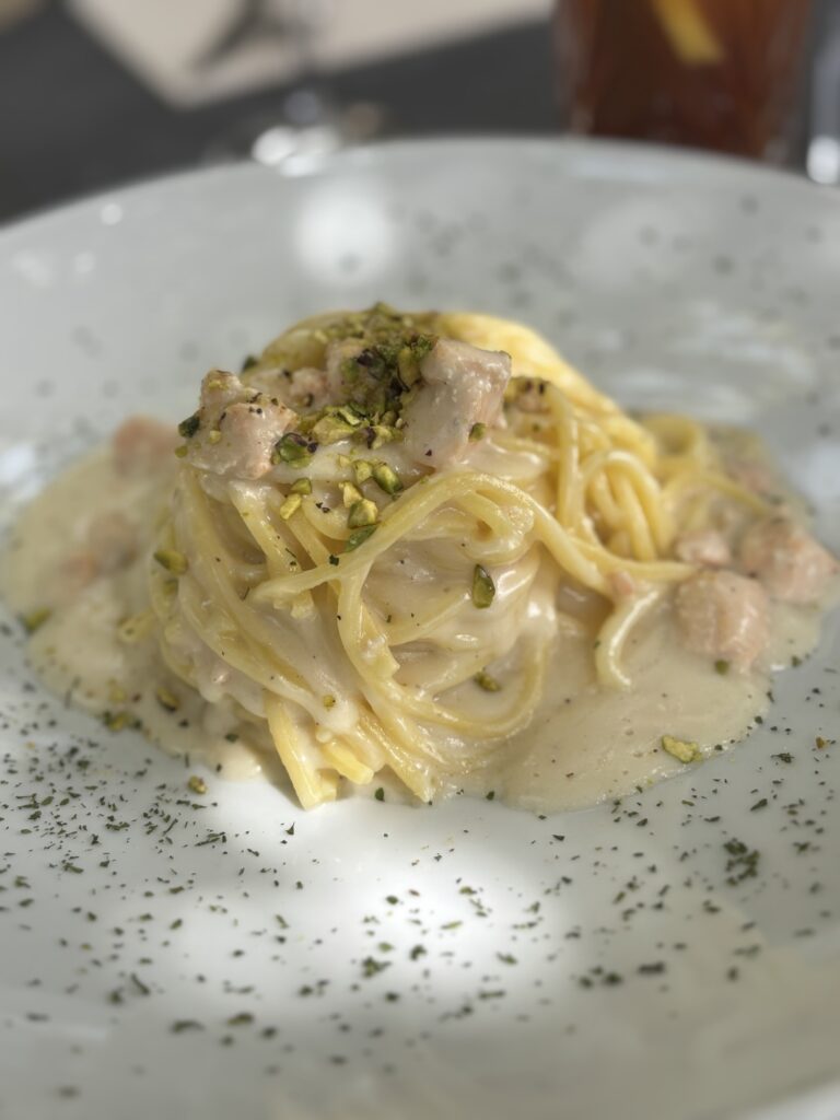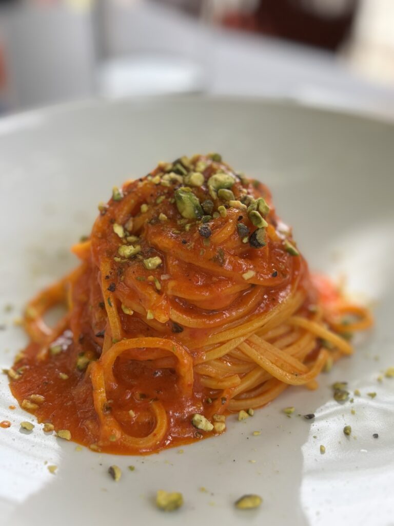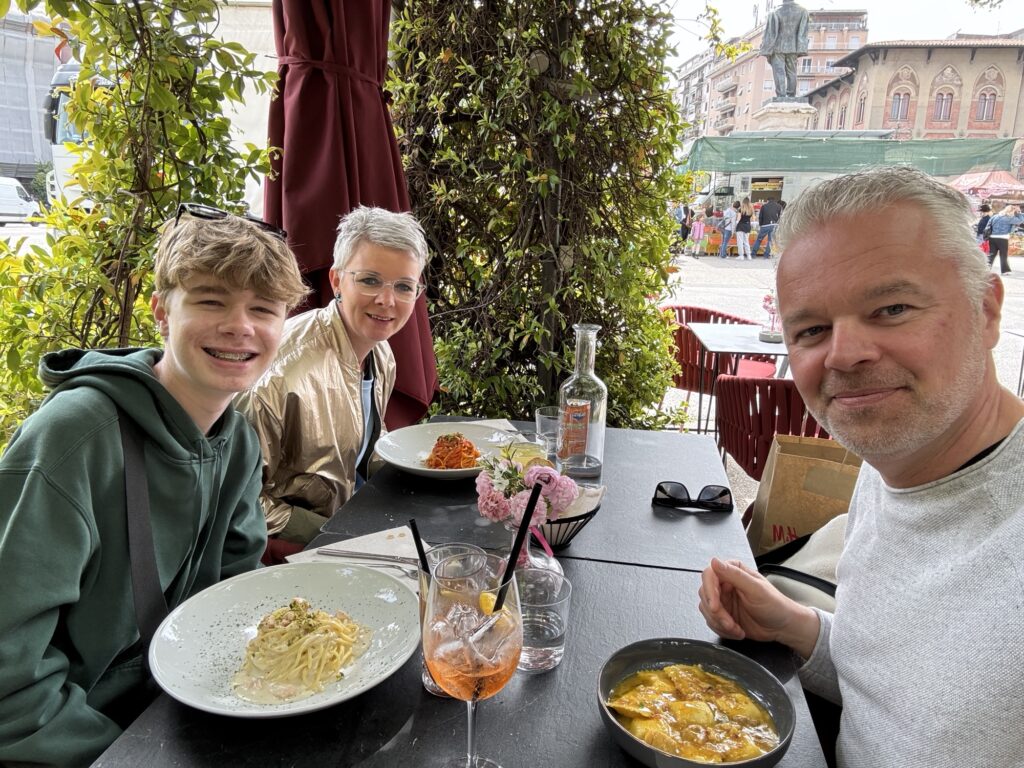In de late voormiddag wandelden we naar het oude centrum waar we door de winkelstraat kuierden en natuurlijk ook af en toe iets kochten. Het hoogtepunt van de dag was zonder twijfel de lunch: in een iets mooier restaurantje aten we elk een heerlijke pasta. Ferre koos voor verse spaghetti alla chitarra met zalm en roomsaus, mama dezelfde spaghetti met een saus op basis van paprika en pistachenoten en papa voor ravioli gevuld met burrata overgoten met een heerlijke ragú van konijn. Tongstrelend heerlijk!!