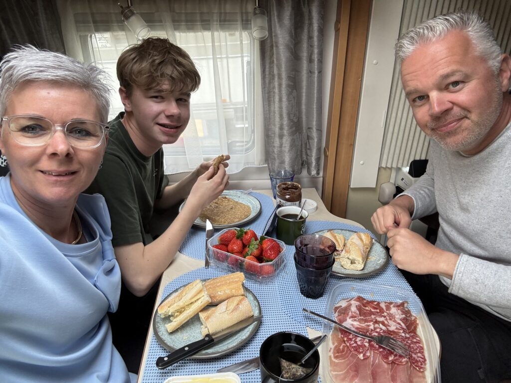 Mama en papa stepten naar de lokale supermarkt voor inkopen voor twee dagen en we aten Italiaanse vleeswaren met brood als avondeten. Behalve Ferre natuurlijk, die at pannenkoeken met (1) aardbei.