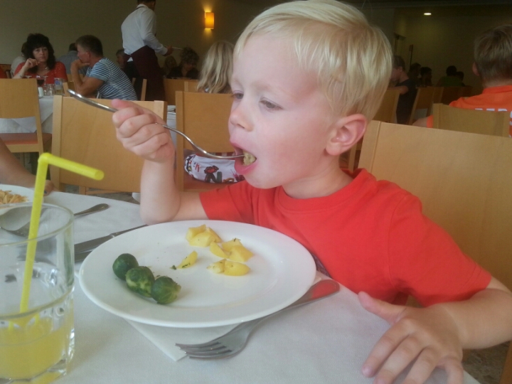 Het hotel is groot, veel volk en de kamers zijn aan de kleine kant. Maar het personeel is vriendelijk, de kamers zijn proper en de buffetten zijn uitgebreid. Ah ja, een hoop keuze en wat kiest Ferre? Aardappelen met spruitjes!