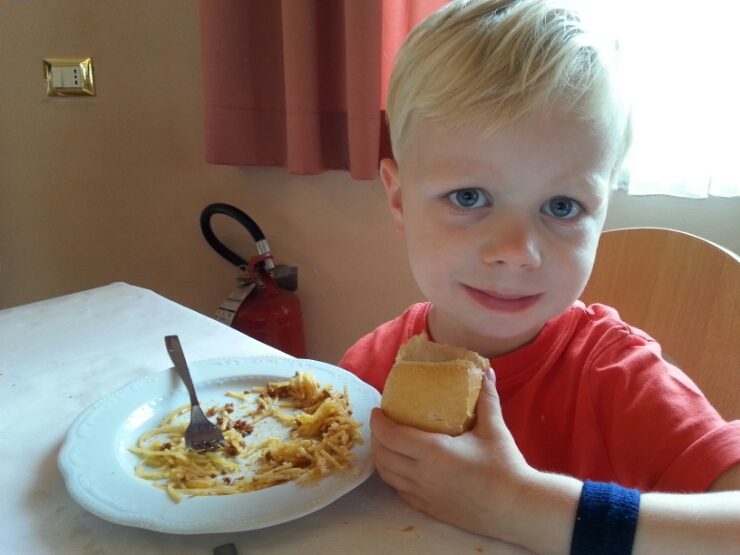 Toen begon de rit naar het Gardameer: de kortste weg, bovendien tolvrij, ging over twee passen helemaal binnendoor. Op papier een goed idee en in de praktijk ook een leuke weg om te rijden, maar de armbandjes tegen wagenziekte hebben niet geholpen bij Ferre. Na een zakje bruine smurrie stopten we nabij Trento in een typisch Italiaans restaurantje (English? No! Francais? No! Deutsch? No!) om een lekkere spaghetti bolognese (spaghetti ragu) te eten.