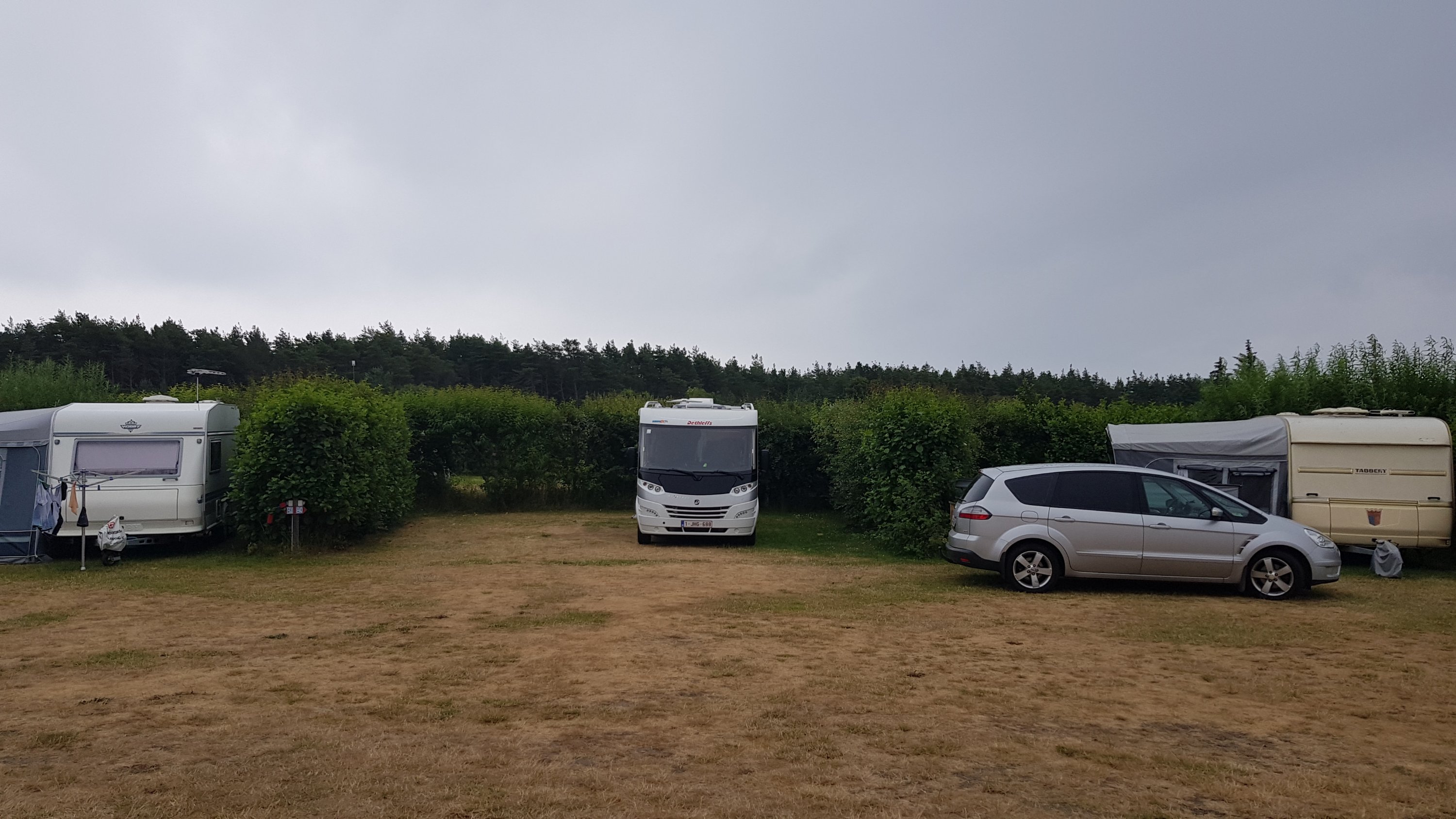Vanochtend ontbeten we met de nog warme broodjes die op de camping vers gebakken worden. De camper werd daarna opgeruimd, water aangevuld, wc leeggemaakt en we konden vertrekken richting Skagen, het meest noordelijke deel van Jutland. De rit van 185km ging weer bijna helemaal over binnenwegen door velden en bossen. Eindelijk hadden we ook eens een stukje autostrade in Denemarken (40km van de route). De regen maakte er een vermoeiende reis van die ongeveer 2.5 uur duurde. We tankten ook de eerste keer in Denemarken, aan 9,99 DKK per liter (ongeveer 1,38 euro per liter). Tankstations zijn hier niet zo dikgezaaid als bij ons, maar met de tank van 90 liter in de nieuwe camper moeten we gelukkig niet vaak tanken.