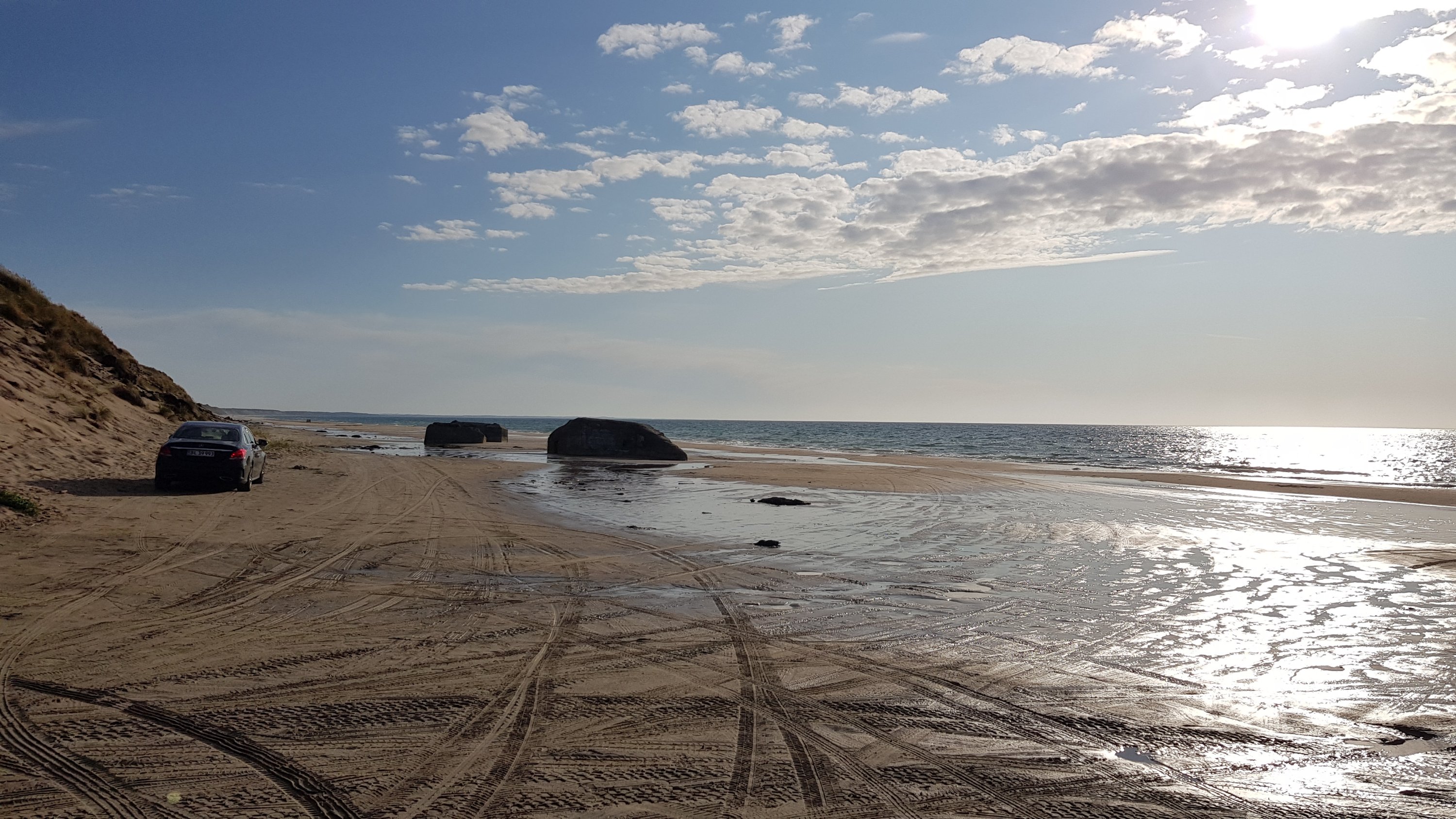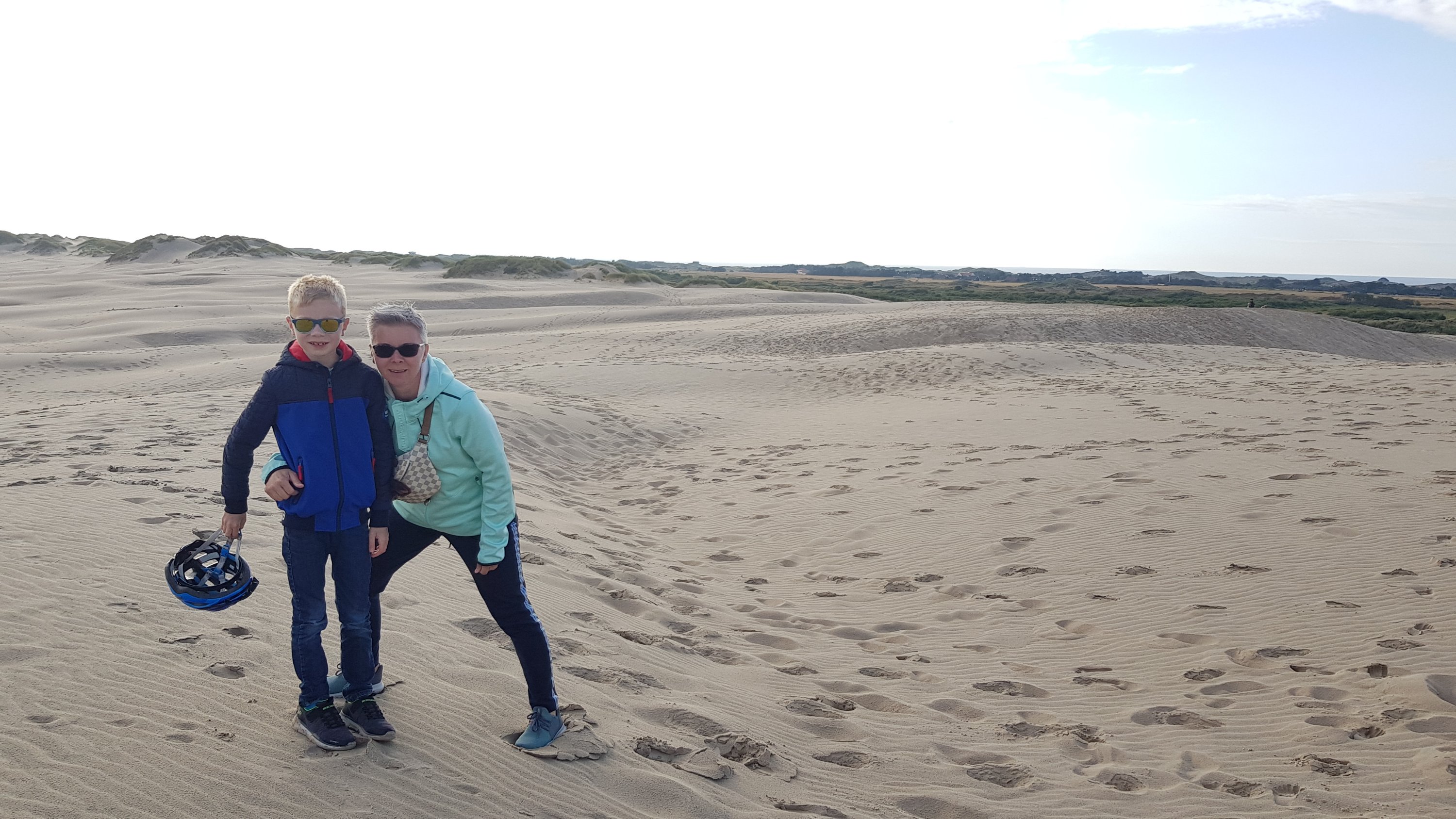 Over een oppervlakte van 4 vierkante kilometer ligt hier witte zand, net alsof je in de woestijn staat.Daarna fietsten we verder naar het westelijke strand van Råbjerg, waar de Noordzee tegen het strand slaat.