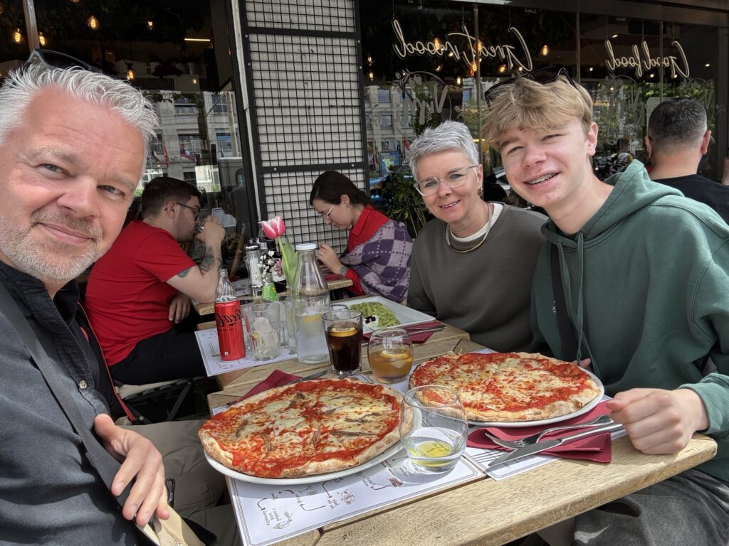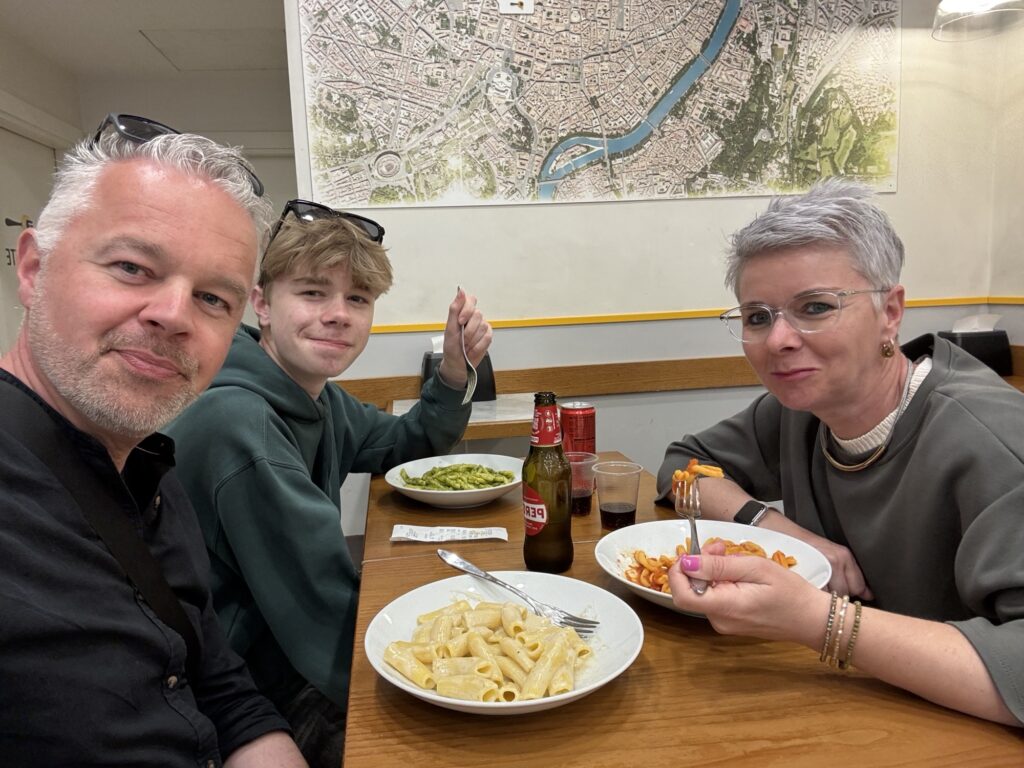 In de late voormiddag wandelden we naar het oude centrum waar we door de winkelstraat kuierden en natuurlijk ook af en toe iets kochten. Het hoogtepunt van de dag was zonder twijfel de lunch: in een iets mooier restaurantje aten we elk een heerlijke pasta. Ferre koos voor verse spaghetti alla chitarra met zalm en roomsaus, mama dezelfde spaghetti met een saus op basis van paprika en pistachenoten en papa voor ravioli gevuld met burrata overgoten met een heerlijke ragú van konijn. Tongstrelend heerlijk!!