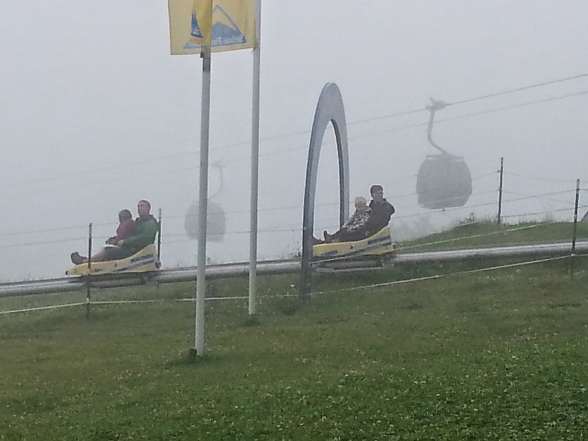 Het weerbericht voorspelde niet veel goeds vandaag, dus trokken we al om 9u richting de Möseralm. Bovenop deze berg waren we de eerste bezoekers zodat de kinderen onmiddellijk op de Fisser Flitser konden. Deze karretjes snellen met een rotvaart van de berg naar beneden, gelukkig wel op een rail. Meestal moet je hier een uurtje voor aanschuiven, maar vanmorgen konden ze er onmiddellijk in stappen.