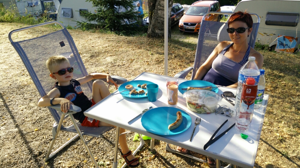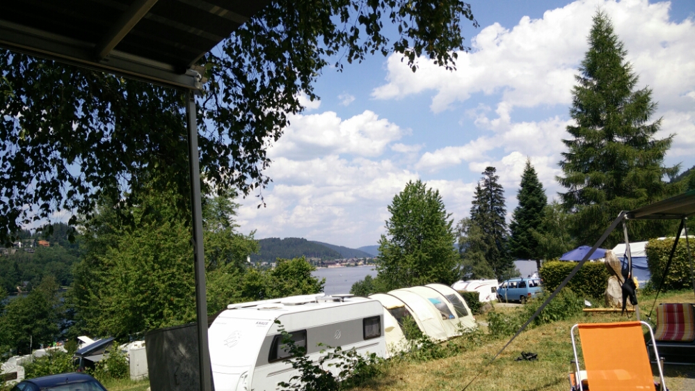 De rit vanmorgen naar de Titisee verliep vlot, op de obligate files na natuurlijk. De temperatuur onderweg liep op tot 33° maar in de camper bleef het redelijk fris. Toen we bijna hier waren (op twintig kilometer) kregen we nog een omleidinkje van 15km over de bergpas voorgeschoteld. Een lange file van vrachtwagens en mobilhomes die in 1ste versnelling over een smalle bergweg tuffen… Niet ideaal op het einde van de reis.