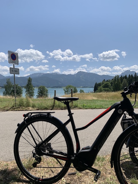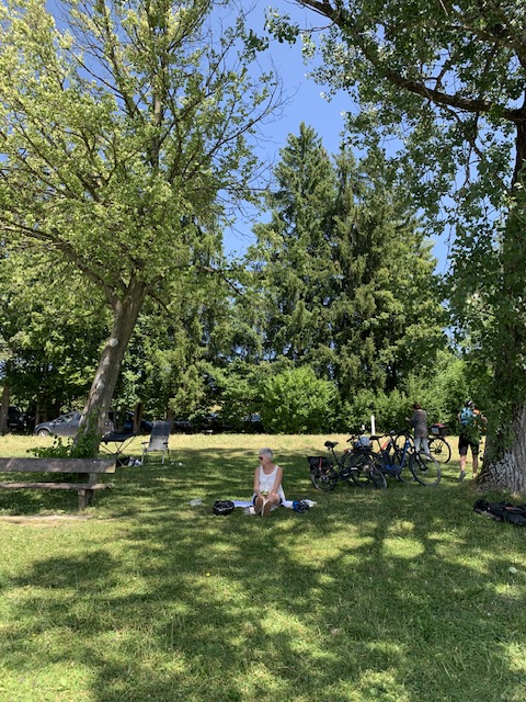 Verse broodjes voor het ontbijt en dan naar de fietsenverhuur. Voor 60 euro huurden we twee e-bikes. Samen met de elektrische plooifiets die we altijd bij hebben, konden we nu samen gaan fietsen. Een tochtje rond het meer stond op de planning. Het zou 30 kilometer zijn volgens de verhuurder, maar met wat mis rijden en wat interessante plekjes maakten we er 47 van. Gelukkig stopten we regelmatig voor een drankje op een terrasje, een picnic aan het water en een ijsje met aardbeien. En onderweg was er natuurlijk genoeg tijd om te genieten van de prachtige omgeving en uitzichten.