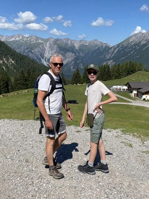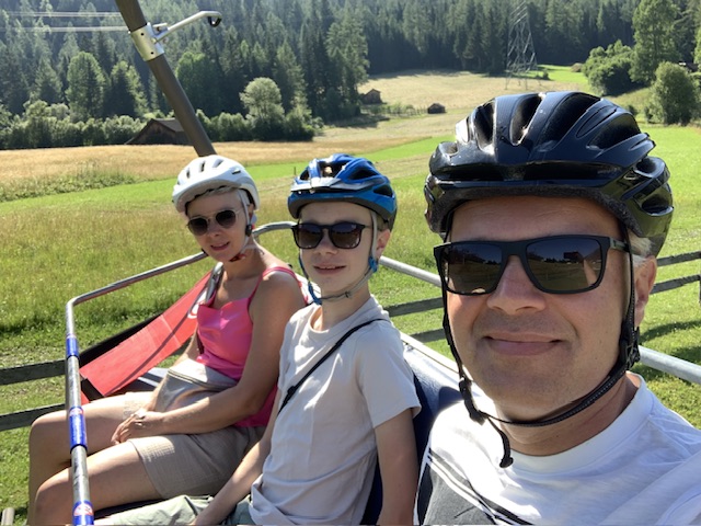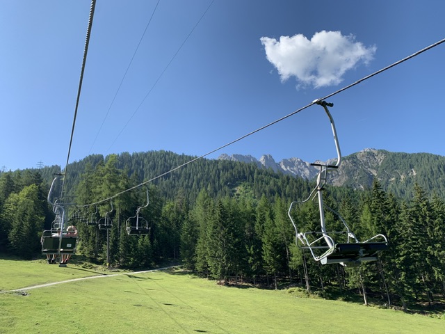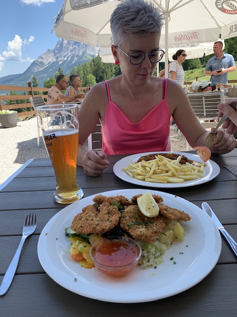 Dan volgde de afdaling naar de middenstation waar we lekker en typisch Oostenrijks konden eten en drinken. Schnitzelburger voor Ferre, Currywurst mit pommes voor mama en een salade met kip voor papa.