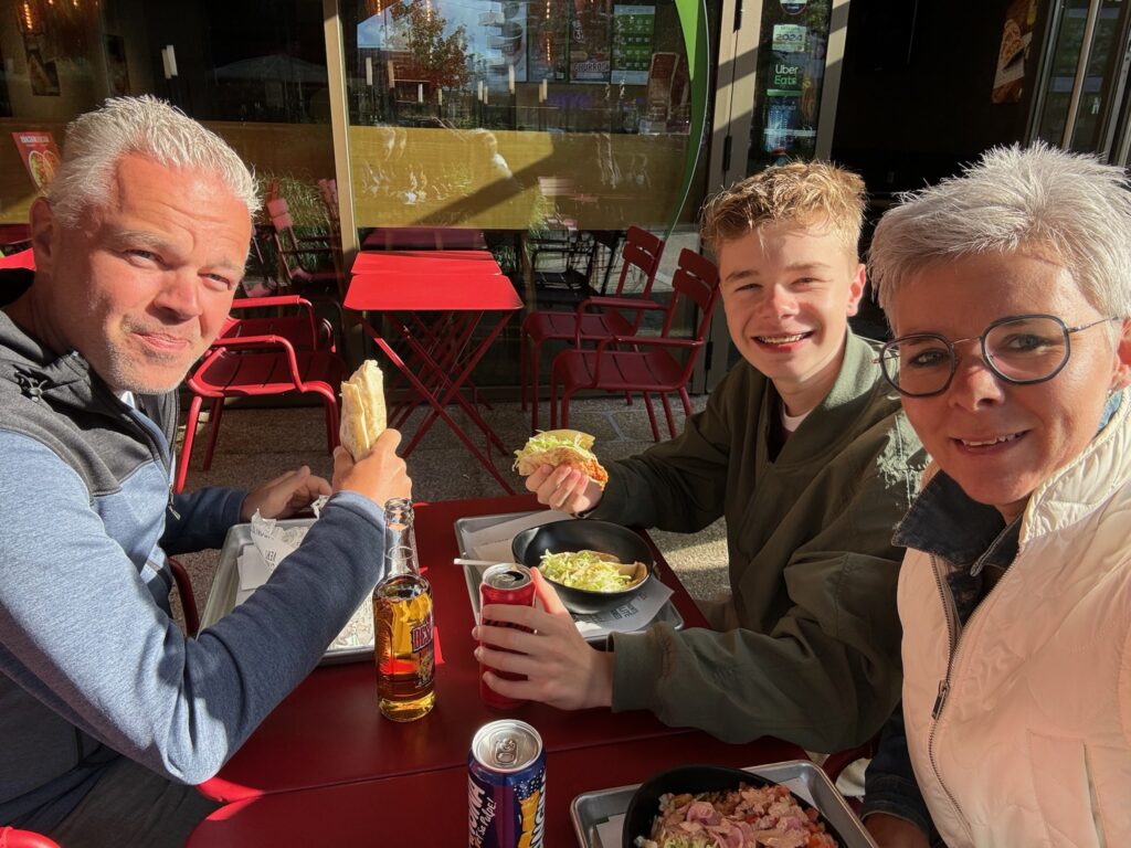We aten Mexicaans in één van de vele restaurantjes in een nabijgelegen shopping center. We bestelden fajita, taco’s en een bowl. Ferre had de pikantheid van de saus slecht ingeschat dus met tranen in de ogen gaf hij zijn taco’s door aan papa, die op zijn beurt zijn mild-pikante fajita naar mama doorschoof zodat Ferre de niet-pikante bowl van mama kon opeten.